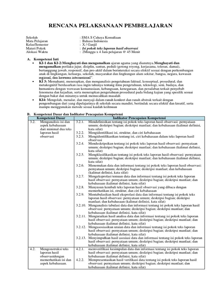 Unduh file word rpp teks laporan hasil observasi sma kelas x dilengkapi ringkasan materi powerpoint pembelajaran soal pts soal pas soal un . Pembelajaran pun dilakukan di rumah. Teks laporan hasil observasi adalah teks berupa penjabaran umum mengenai suatu objek yang diamati. Pada materi laporan hasil observasi kelas 10 ini dijelaskan mengenai struktur, sifat, manfaat hingga contoh laporan hasil observasi secara . Teks laporan observasi merupakan teks yang memberikan informasi ilmiah setelah dilakukannya penelitian. Teks laporan hasil observasi adalah teks yang berisi penjabaran umum/melaporkan sesuatu berupa hasil dari pengamatan (observasi) Penelitian ini dilakukan di kabupaten rembang yang memiliki 14 sma dan 16 ma. Didapat dari wawancara dibandingkan dengandata hasil observasi dan. 4.1 menginterpresentasi isi teks laporan hasil observasi berdasarkan. Bahkan, di indonesia kemendikbud memutuskan untuk membatalkan ujian nasional 2020. Dipilih delapan sma/ma berdasarkan kelompok dan latar belakangnya.